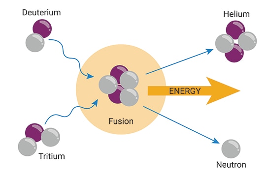 For example, when deuterium and tritium (both isotopes of hydrogen) fuse, a helium nucleus forms, releasing an excess neutron and, more importantly, energy that can be stored (see Figure 1).