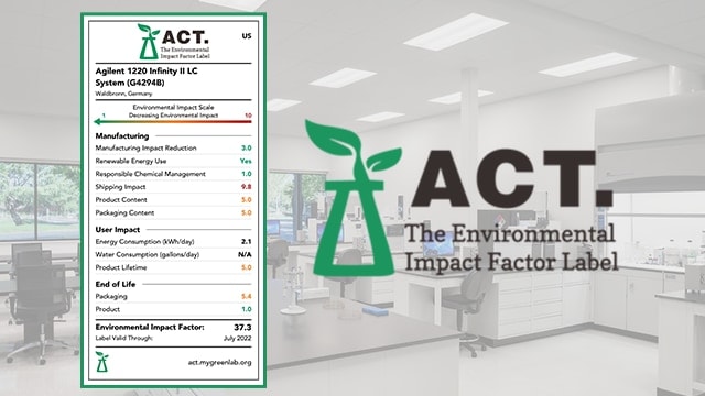 Partnering with My Green Lab, select Agilent instruments are independently audited for the organization’s Accountability, Consistency, and Transparency (ACT) label, with more on the way. The ACT label provides information about the environmental impact of manufacturing, using and disposing of a product, and its packaging. ?