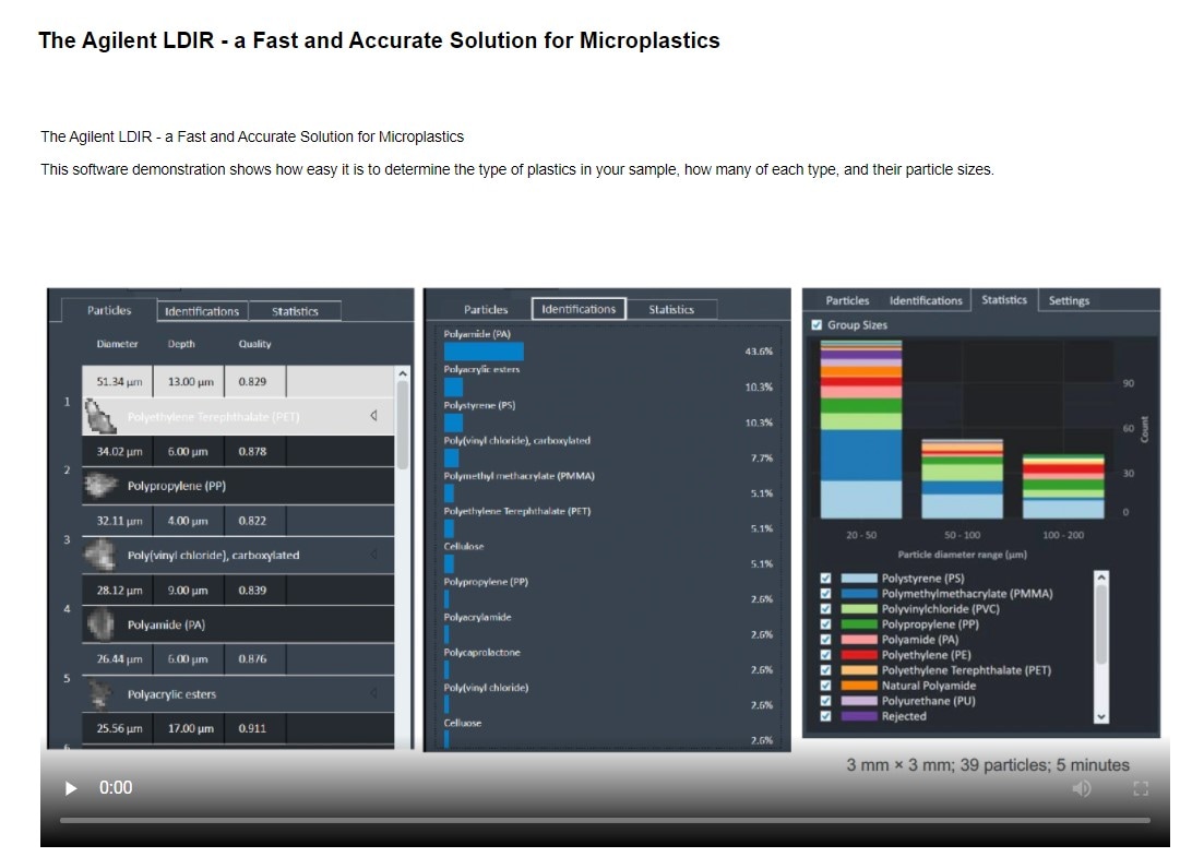 Agilent provides solutions for the detection and analysis of microplastics. Infrared (IR) imaging provides the opportunity to simultaneously identify the shape, size, and characterization of microplastics; something that is lacking in many other analyzation techniques. In addition, Agilent offers both benchtop and portable handheld solutions to analyze microplastics onsite in the environment enabling immediate and real-time information.