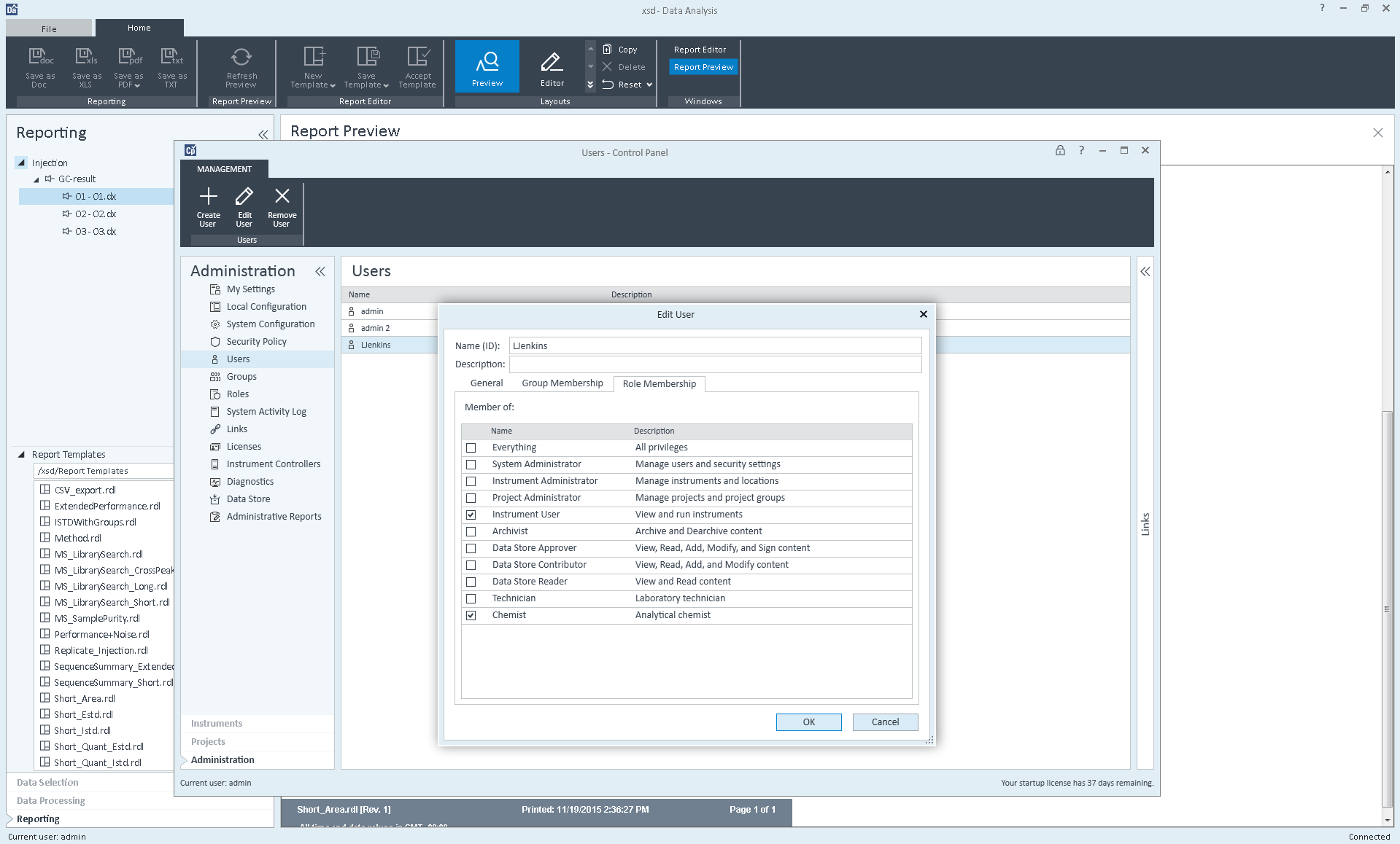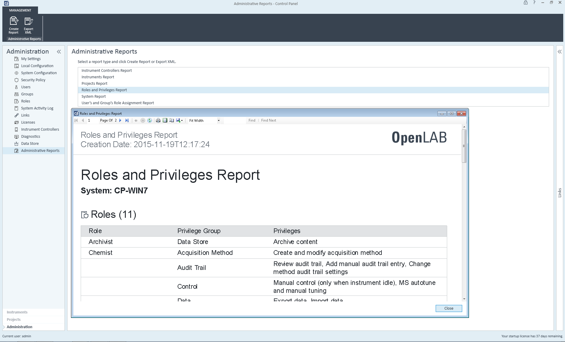 Figure 3 Example of Roles and Privileges Report in OpenLab CDS.