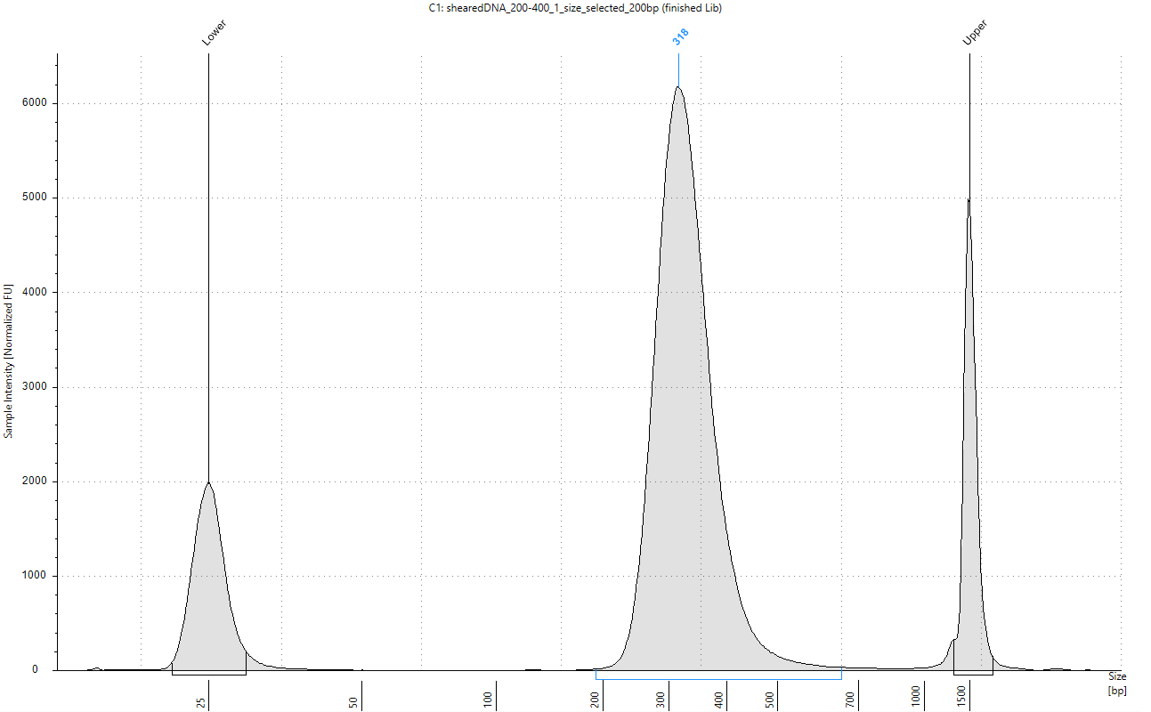 Final library of a ChIP-Seq workflow analyzed on a TapeStation system with the D1000 ScreenTape assay. Successful libraries show a narrow library distribution with a peak size of 120–130 bp larger than the starting material. In this example, the final library shows a maximum peak size of 318 bp, correlating to an insert size of 200 bp.