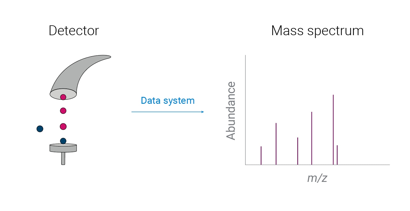 To produce the mass spectrum, the detector records the signal intensity from ions arriving at each given time. The pattern of this mass spectrum can be used for identification, much like a fingerprint. In addition, the response recorded for the different ion species can be calibrated for quantitative purposes.