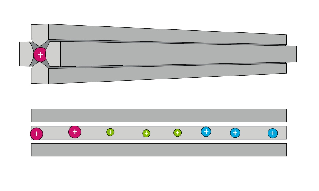 A quadrupole consists of four rods to which a direct current voltage and radio frequency are applied. Various combinations of these forces ensure that only fragments of a specific mass—called a mass-to-charge ratio or m/z—will travel down the quadrupole’s electric field toward the detector at a given time. This feature dramatically decreases noise and increases sensitivity.