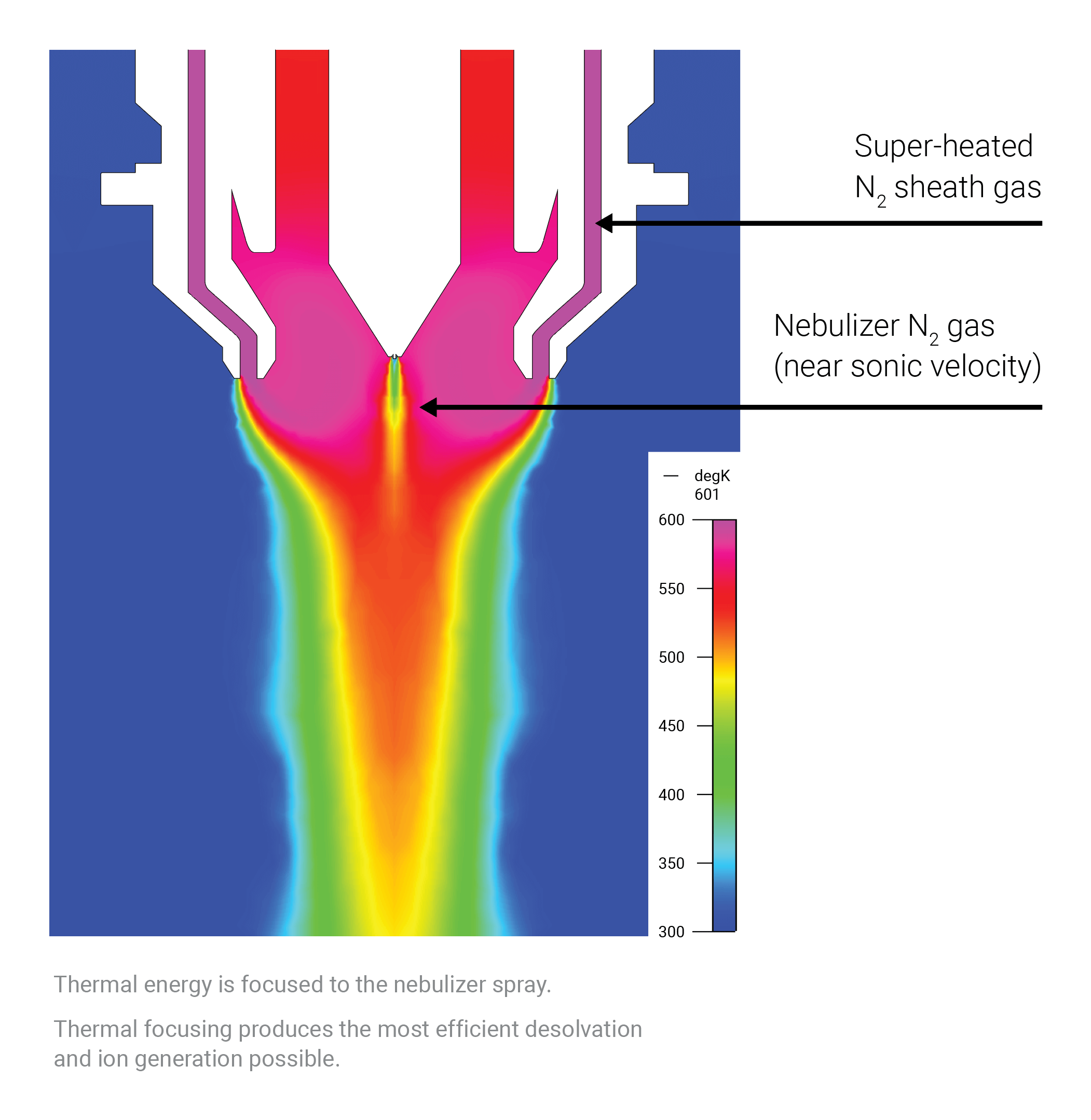The thermal gradient focusing technology used in the Agilent Jet Stream ion source extends electrospray ionization sensitivity for an array of applications and flow rates. This technology for high-sensitivity MS uses superheated nitrogen to improve droplet desolvation and ion generation for a stronger signal and reduced noise. It offers the highest sensitivity for most analytes, and a response that’s five-fold higher or more relative to standard electrospray ionization.