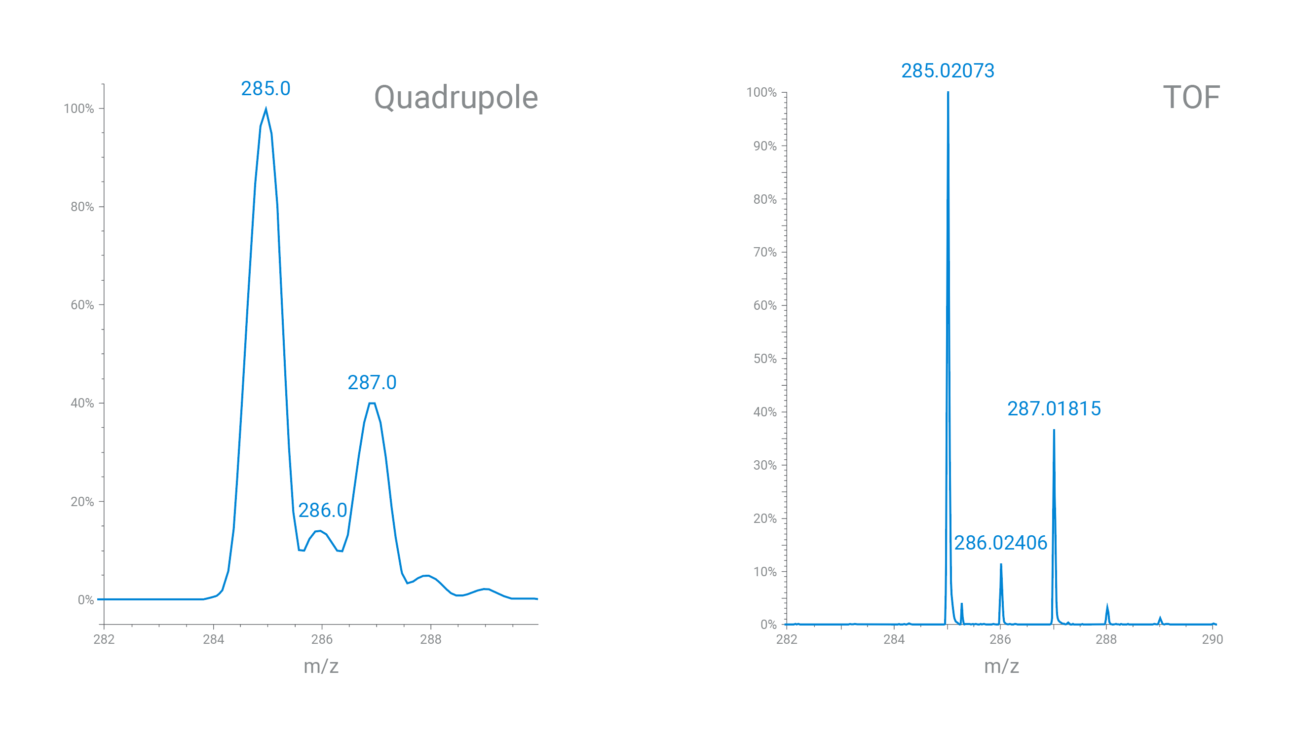A single (or triple) quadrupole mass spectrometer delivers nominal mass (low resolving power). Time-of-flight (TOF) instruments can deliver accurate mass information (high resolving power).