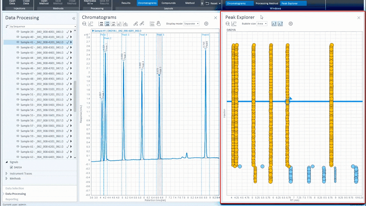 Sometimes a picture is worth a thousand words. Peak Explorer presents a multi-dimensional “bubble chart” view of a complex data set, allowing you to easily spot trends, unexpected or missing peaks, retention time shifts, integration problems, outliers, or artifacts.