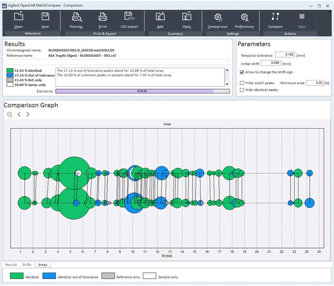Match Compare for OpenLab provides the ability to objectively compare unknown samples to a known standard based on user defined constraints.