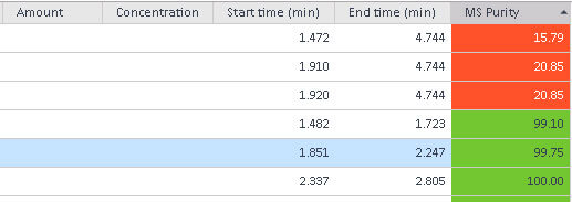 Automatically flag peaks that have spectra changes across the peak. Provides a tool to calculate and provide values to establish level of purity, based on specific user defined MS or UV spectra purity.
