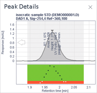 Peak Details lets you zoom in on a selected peak and see details such as retention time and area.