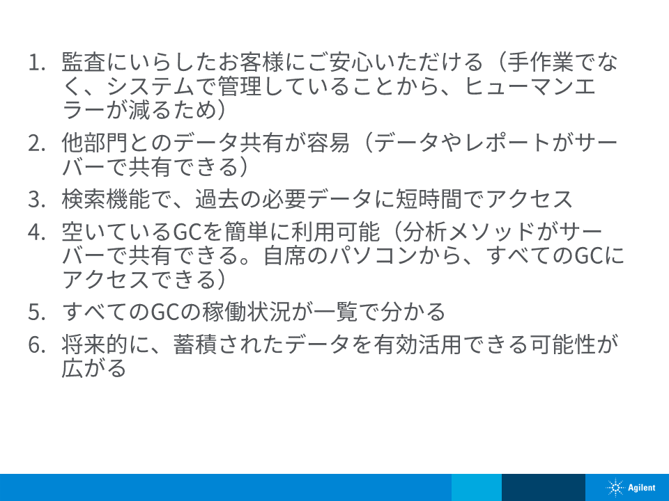 第1期はアジレントのGCのみを接続しているため、1つのソフトウェアでメーカーを問わずすべてのGCを制御したいというニーズは満たされていません?!窯CをOpenLabに接続する計畫は、3期に分けて考えています。第1期ではアジレント製のGCを、第2期では他社製GCの一部を、第3期では他社製のGCの殘りを接続するという計畫です。非常に順調(diào)に稼動しているので、第3期では、前倒しでLCも組み込んでいこうとしています。」と山田 氏は話しています。第3期まで進(jìn)めば、複數(shù)のソフトウェアの操作を習(xí)得する時間とコストが削減できるようになります。その後は、OpenLab環(huán)境を上位のシステムとも接続する計畫だといいます。ここまでくれば、手計算?手書き?間違い探しが不要となり、転記やシステム入力に伴うヒューマンエラーも削減できるようになります。